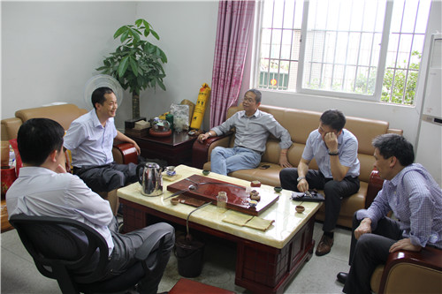 梁书记一行与广东优巨新材料研究有限公司王贤文(左二)洽谈