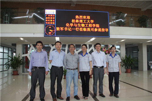 在广东江门,梁书记一行到江门四方威凯精细化工有限公司进行参观考察,在公司副总经理兼技术总监、91级校友朱洪江的陪同下参观了公司的研发中心以及生产工艺流程,双方就毕业生就业实习、产学研合作等方面达成共识,并举行了“桂林理工大学实习实训就业基地”的挂牌仪。在广东优巨先进材料研究有限公司,该公司总经理王贤文热情接待了梁书记一行,双方就毕业生就业实习、教师到企业挂职锻炼以及科研成果转化等方面达成合作意向。会谈结束后,双方举行了“桂林理工大学实习实训就业基地”的挂牌仪式。