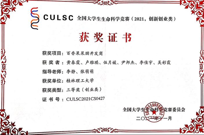 导航痕迹 当前位置: 首页 >> 教育教学 >> 生物工程专业认证 >> 正文 生物工程专业学子在2021年全国大学生生命科学竞赛全国总决赛喜获佳绩 近日,2021年全国大学生生命科学竞赛落下帷幕,经过预赛、省赛、国赛三个环节的激烈角逐,2138CC太阳集团2138CC太阳集团生物工程专业邓全毅同学负责的作品《改性果胶制备纳米银及其抗菌机理的研究》(指导老师:李培骏、李海云)获科学探究类一等奖,黄春霞同学负责的作品《百香果果脯开发商》(指导老师:李静、张萌萌)获创新创业类三等奖。 全国大学生生命科学竞赛(CULSC)”由教育部高等大学生物学课程教学指导委员会、教育部高等学校生物科学类专业教学指导委员会、教育部高等学校生物技术、生物工程类专业教学指导委员会和《高校生物学教学研究》杂志共同倡议举办,是全国高校生命科学领域的顶级权威赛事,旨在搭建全国生物学科大学生互动交流平台,从课题的完成度和社会意义等方面综合考察学生的实验能力、团队合作能力和思辨能力。该赛事已纳入“2020全国普通高校大学生竞赛排行榜”,是教育部官方认可的,最具含金量、最具参赛价值的赛事之一。 据悉,本次大赛创新创业类赛道共产生特等奖36项、一等奖320项、二等奖461项,三等奖633项,科学探究类赛道共产生一等奖137项、二等奖205项、三等奖414项。 科学探究类作品《改性果胶制备纳米银及其抗菌机理的研究》获奖证书 创新创业类作品《百香果果脯开发商》获奖证书 【 发布日期:2022-01-05 浏览次数: 】 上一条:生物工程专业认证——自评报告专家意见回复讨论会 下一条:生物工程专业优秀校友回访母校座谈交流