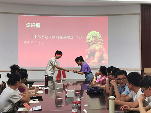 活动开始,朱皓同志向与会党员介绍了本次会议的目的及意义,他指出:过“政治生日”就是引导党员始终牢记自己的党员身份,永葆初心;随后,在林京宇同志的带领下,全体党员重温入党誓词;接着,向入党时间为上半年的同志赠送一份专属“政治生日”贺卡及纪念品;最后,党员们对照合格党员标准畅谈了自身的差距与今后努力的方向。