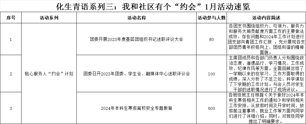 导航痕迹 当前位置: 首页 >> 学生工作 >> 学生活动 >> 正文 【化生青语】化生青语系列三:我和社区有个“约会”1月活动速览 作者: 发布日期:2024-01-18 浏览次数: 为扎实推进学校“一站式”学生社区综合管理模式建设试点工作和2138CC太阳集团“三全育人”综合改革工作,提升学院“一站式”学生社区影响力,2138CC太阳集团将“一站式”学生社区以“党建+X”模式为基础,结合学院【化生青语】育人文化,将学院育人体系下沉社区,打造【化生青语】系列三——我和社区有个“约会”特色活动。1月份,结合学院社区团队,按照学院社区我和社区有个“约会”特色品牌活动,主要开展贴心服务人“约会”计划,同助力学院学子发展。按照“约会计划”,学院举办活动如下。 (一审:张伟颀 二审:黄道坤 三审:李少华) 上一条:学院开展2024年春季学期“开学第一课”专题教育 下一条:学院开展2024年本科生寒假离校安全专题教育