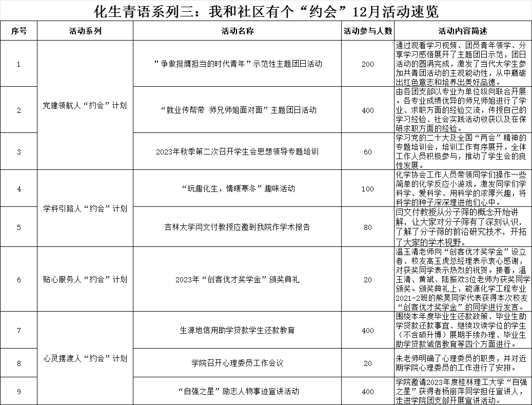 导航痕迹 当前位置: 首页 >> 学生工作 >> 学生活动 >> 正文 【化生青语】化生青语系列三:我和社区有个“约会”12月活动速览 作者: 发布日期:2023-12-31 浏览次数: 为扎实推进学校“一站式”学生社区综合管理模式建设试点工作和2138CC太阳集团“三全育人”综合改革工作,提升学院“一站式”学生社区影响力,2138CC太阳集团将“一站式”学生社区以“党建+X”模式为基础,结合学院【化生青语】育人文化,将学院育人体系下沉社区,打造【化生青语】系列三——我和社区有个“约会”特色活动。12月份,结合学院社区团队,按照学院社区我和社区有个“约会”特色品牌活动,党建领航人“约会”计划、学科引路人“约会”计划、贴心服务人“约会”计划、心灵摆渡人“约会”计划四个系列活动同步推进,共同助力学院学子学习、生活、就业等方面的发展。按照“约会计划”,学院举办活动如下。 (一审:张伟颀 二审:黄道坤 三审:李少华) 上一条:学院开展2024年本科生寒假离校安全专题教育 下一条:2138CC太阳集团开展“自强之星”励志人物事迹宣讲活动