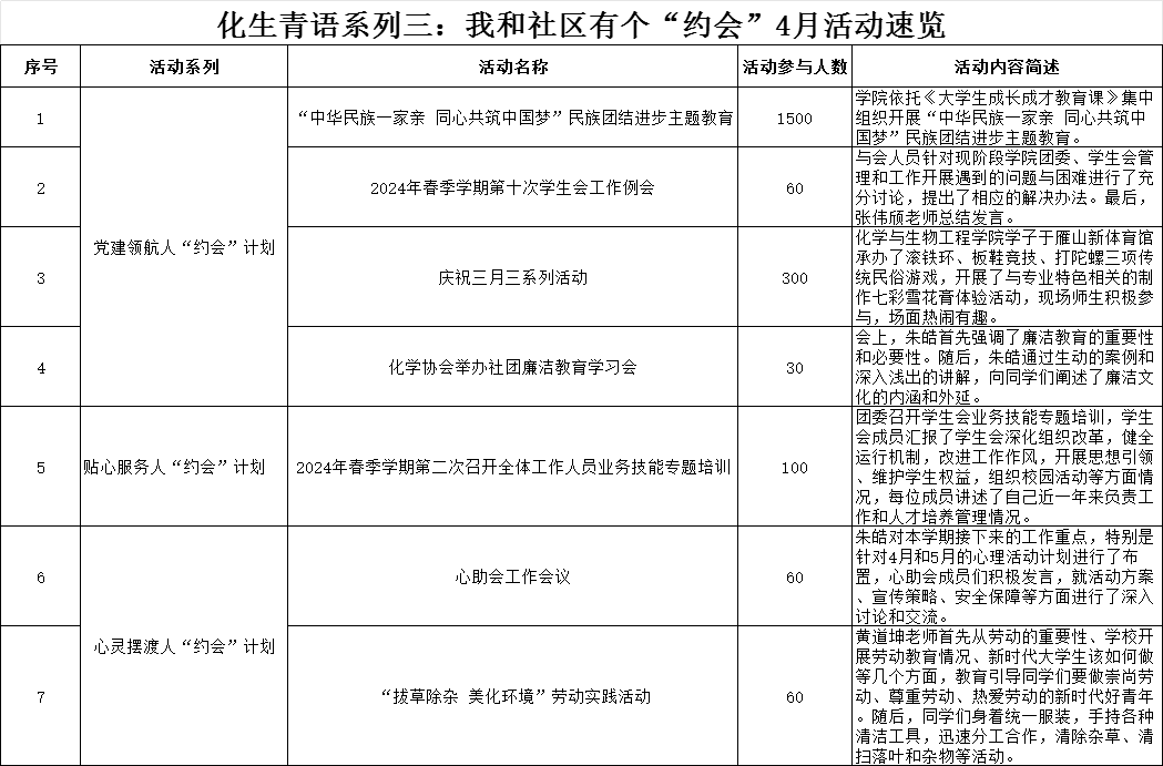 导航痕迹 当前位置: 首页 >> 学生工作 >> 学生活动 >> 正文 【化生青语】化生青语系列三:我和社区有个“约会”4月活动速览 作者: 发布日期:2024-04-30 浏览次数: 为扎实推进学校“一站式”学生社区综合管理模式建设试点工作和2138CC太阳集团“三全育人”综合改革工作,提升学院“一站式”学生社区影响力,2138CC太阳集团将“一站式”学生社区以“党建+X”模式为基础,结合学院【化生青语】育人文化,将学院育人体系下沉社区,打造【化生青语】系列三——我和社区有个“约会”特色活动。4月份,结合学院社区团队,按照学院社区我和社区有个“约会”特色品牌活动,党建领航人“约会”计划、贴心服务人“约会”计划、心灵摆渡人“约会”计划三个系列活动同步推进,共同助力学院学子学习、生活等方面的发展。按照“约会计划”,学院举办活动如下。 (一审:陈千癸 二审:黄道坤 三审:李少华) 上一条:学院开展郑州大学化学学院研究生招生宣讲会 下一条:学院化学协会举办社团廉洁教育学习会