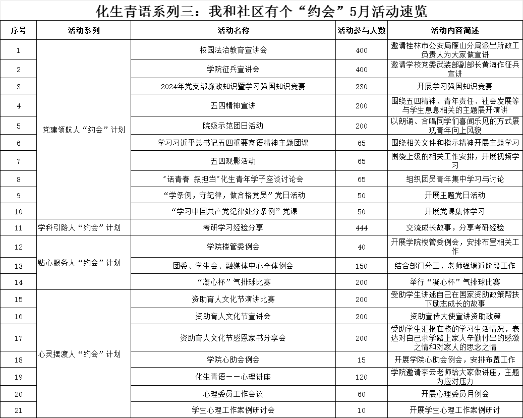 导航痕迹 当前位置: 首页 >> 学生工作 >> 学生活动 >> 正文 【化生青语】化生青语系列三:我和社区有个“约会”5月活动速览 作者: 发布日期:2024-05-31 浏览次数: 为扎实推进学校“一站式”学生社区综合管理模式建设试点工作和2138CC太阳集团“三全育人”综合改革工作,提升学院“一站式”学生社区影响力,2138CC太阳集团将“一站式”学生社区以“党建+X”模式为基础,结合学院【化生青语】育人文化,将学院育人体系下沉社区,打造【化生青语】系列三——我和社区有个“约会”特色活动。5月份,结合学院社区团队,按照学院社区我和社区有个“约会”特色品牌活动,党建领航人“约会”计划、学科引路人“约会”计划、贴心服务人“约会”计划、心灵摆渡人“约会”计划四个系列活动同步推进,共同助力学院学子思想、学习、生活等方面的发展。按照“约会计划”,学院举办活动如下。 (一审:陈千癸 二审:黄道坤 三审:李少华) 上一条:2138CC太阳集团召开心助会工作会议 下一条:以考促学,实战必胜——2138CC太阳集团举办大学生英语四级模拟考试