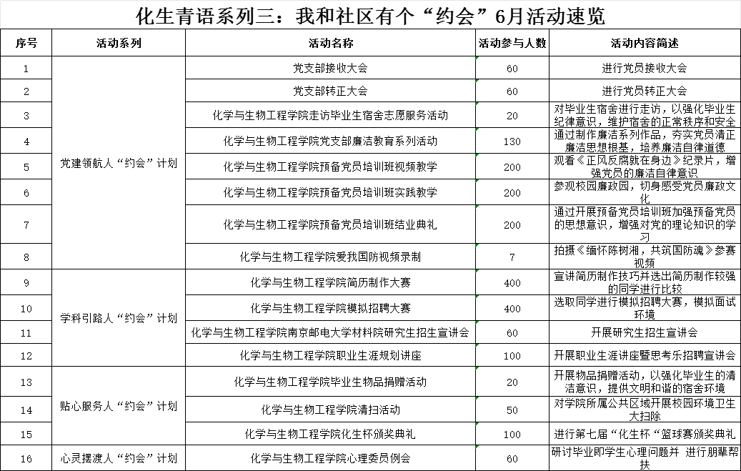 导航痕迹 当前位置: 首页 >> 学生工作 >> 学生活动 >> 正文 【化生青语】化生青语系列三:我和社区有个“约会”6月活动速览 作者: 发布日期:2024-06-30 浏览次数: 为扎实推进学校“一站式”学生社区综合管理模式建设试点工作和2138CC太阳集团“三全育人”综合改革工作,提升学院“一站式”学生社区影响力,2138CC太阳集团将“一站式”学生社区以“党建+X”模式为基础,结合学院【化生青语】育人文化,将学院育人体系下沉社区,打造【化生青语】系列三——我和社区有个“约会”特色活动。6月份,结合学院社区团队,按照学院社区我和社区有个“约会”特色品牌活动,党建领航人“约会”计划、学科引路人“约会”计划、贴心服务人“约会”计划、心灵摆渡人“约会”计划四个系列活动同步推进,共同助力学院学子学习、生活、就业等方面的发展。按照“约会计划”,学院举办活动如下。 (一审:陈千癸 二审:黄道坤 三审:李少华) 上一条:【化生青语】化生青语系列三:我和社区有个“约会”7月活动速览 下一条:学院举办2024年春季学期校园清扫活动