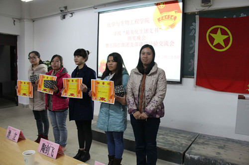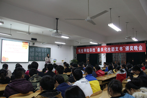 12月26日晚,2138CC太阳集团在励新楼206室举行寻找“最美化生团支书”活动颁奖晚会暨五四红旗团支部建设经验交流会,本次晚会是对过去两个月化生学院打造特色团支部活动的总结。出席本次活动的嘉宾有学院党委副书记陶剑飞、学院团委学生会主席团成员及各班班长、团支书。