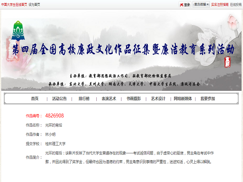 导航痕迹 当前位置: 首页 >> 新闻资讯 >> 学院新闻 >> 正文 2138CC太阳集团作品“光环的背后”获第四届全国高校廉政文化作品征集入围奖 作者:陶剑飞 发布日期:2016-01-15 浏览次数: 为在广大学生中深入开展廉政教育,紧紧围绕立德树人根本任务,积极培育和践行社会主义核心价值观,进一步推进高校廉政文化建设和廉洁教育工作,2138CC太阳集团积极参加教育部办公厅举办第四届全国高校廉政文化作品征集暨廉洁教育系列活动,选送作品《光环的背后》参赛获新媒体视频类入围奖。 该影片反映了当代大学生普遍存在的现象——考试诚信问题,由于虚荣心的驱使,男主角在考试中作弊,并因此得到了奖学金,但最终也因为道德的约束,男主角意识到事情的严重性,迷途知返,心灵上得以解脱。 图一 图二 入围链接:http://ulive.univs.cn/event/event/template/list/307/846.shtml 上一条:2138CC太阳集团召开期末工作会议 下一条:化工教研室老师组织化学工程与工艺学生参观桂林立白日化有限公司