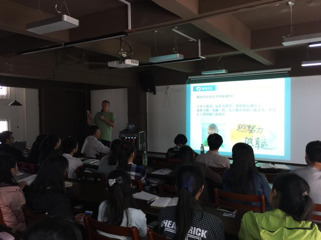 李贵义总经理首先以幽默风趣的语言讲述了自己的学习和工作经历,强调了确定人生方向和努力的重要性;接着结合国家的政策背景讲述了集崎生化的发展历程,并详细介绍了公司围绕农用微生物、农用植物提取物和农用喷雾助剂三大发展方向开发的相关产品和推广应用情况。他从植物生理角度大力发展微生物、微生态领域的基本情况进行了深入浅出的分析,对未来有益微生物是绿色农业的核心内容进行了深入的讲解。他提到:我们学科的发展方向也要跟上时代的进步速度,以绿色、提质、增收和健康为主旨,实现农药化肥零增长。一是利用生物农药、植物提取农药对抗病虫害;二是生态治理,形成合理的食物链;三是利用有益微生物来改良土壤环境,调理土壤酸碱度。