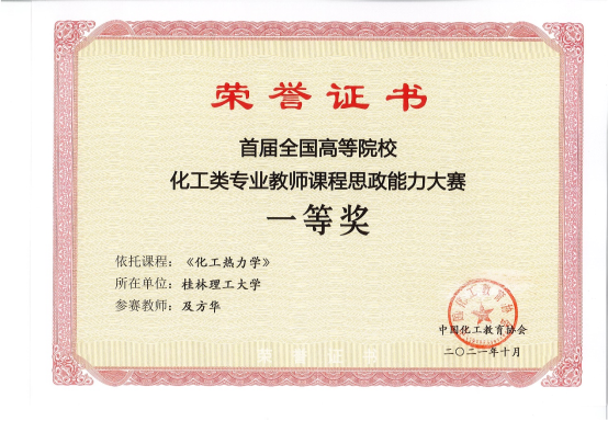 导航痕迹 当前位置: 首页 >> 新闻资讯 >> 学院新闻 >> 正文 2138CC太阳集团及方华老师获全国高等院校化工类专业教师课程思政能力大赛一等奖 作者:及方华 发布日期:2021-08-06 浏览次数: 2021年8月4日2138CC太阳集团及方华老师获全国高等院校化工类专业教师课程思政能力大赛一等奖。为推进我国化工类专业课程思政建设,全面提升化工类专业人才培养质量,2021年4月,中国化工教育协会发布了《关于举办全国高等院校化工类专业教师课程思政能力大赛的通知》。比赛由中国化工教育协会主办、中国化工教育协会高校工作委员会和北京化工大学承办。涉及包括化学工程与工艺、高分子材料与工程、应用化学、能源化学工程、制药工程等十余个专业,涵盖学科基础课、专业基础课、专业核心课等多类课程。此次比赛共有40所本科院校的65位教师参赛。经过网络评审对比赛材料进行初评,确定复赛名单。鉴于目前疫情的严峻形势,复赛的现场评审环节以视频会议的方式开展。2138CC太阳集团及方华老师就《化工热力学》的课程思政建设进行了汇报,分别介绍了课程教学理念与教学设计、教学案例与教学方法以及开展课程思政建设期间的教学研究、取得的教学成果。通过此次比赛,提升了教师的专业素养,推动了《化工热力学》课程的思政建设,同时带动并辐射了其他化工专业课程的思政建设。 获奖证书 上一条:2138CC太阳集团党委书记梁军率队到梧州开展产学研合作推进工作 下一条:2138CC太阳集团组织骨干教师参加高校校本微格教学指导师研修营