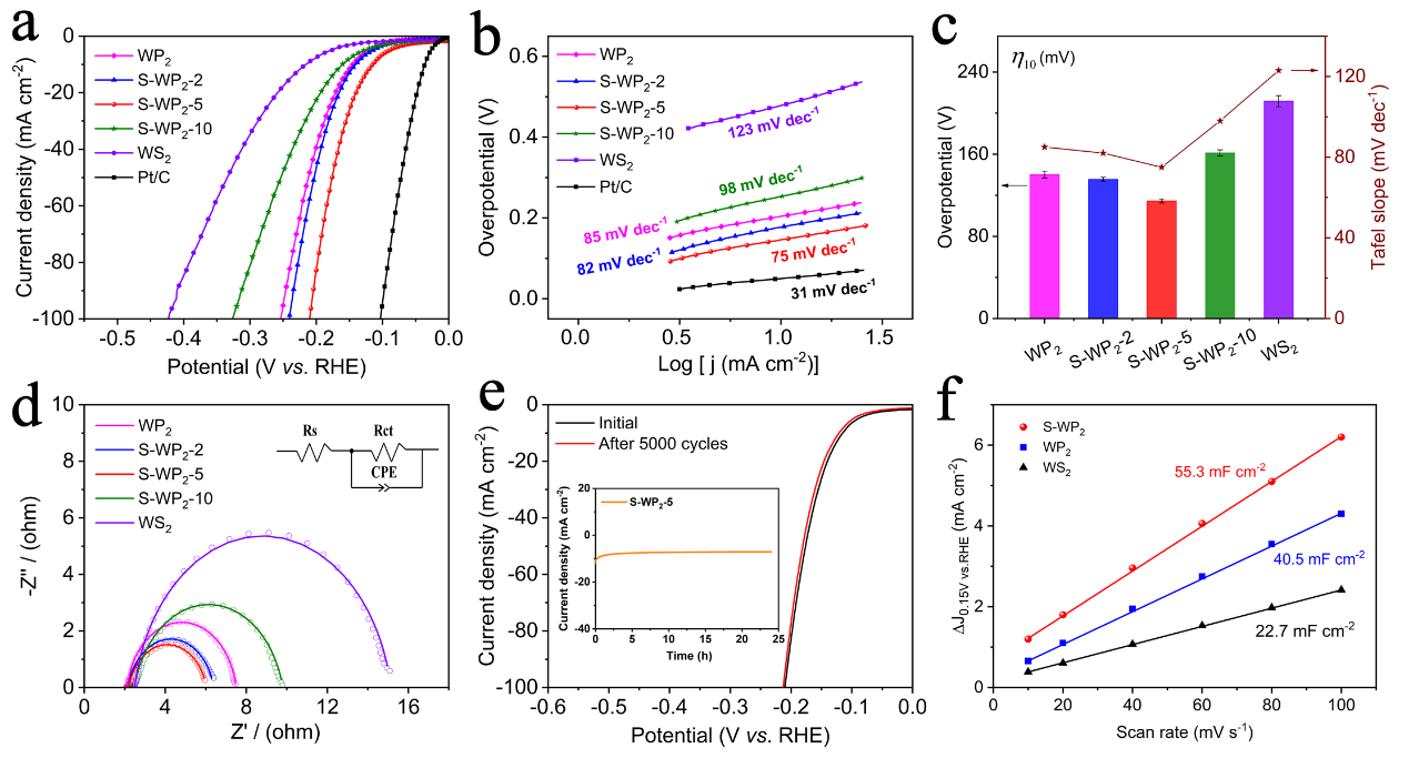 图4. S-WP2材料的电催化性能。