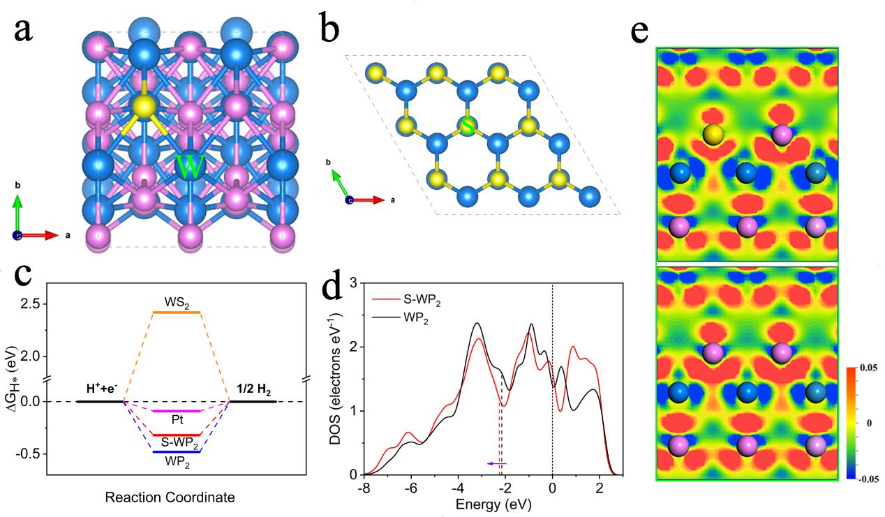 本文通过磷化还原和硫掺入同时反应制备了一种自支撑材料S-WP2纳米片阵列。由于纳米片阵列结构和部分硫原子的掺杂,使得S-WP2具有较高的电导率和电化学比表面积,在酸性电解液中表现出显著的HER活性和稳定性。与WP2相比,S-WP2在10 mA cm-2下的过电位从-140 mV降低到-115 mV(vs. RHE),并保持24小时而没有明显的衰减。密度泛函计算证明,硫掺杂可以有效地调控WP2的电子结构,削弱金属表面与氢原子之间的相互作用,促进氢的释放,从而提高WP2的本征活性。这一研究成果对于构建价格低廉的非贵金属柔性电催化电极具有重要的参考,在电催化分解水制氢中具有潜在应用价值。