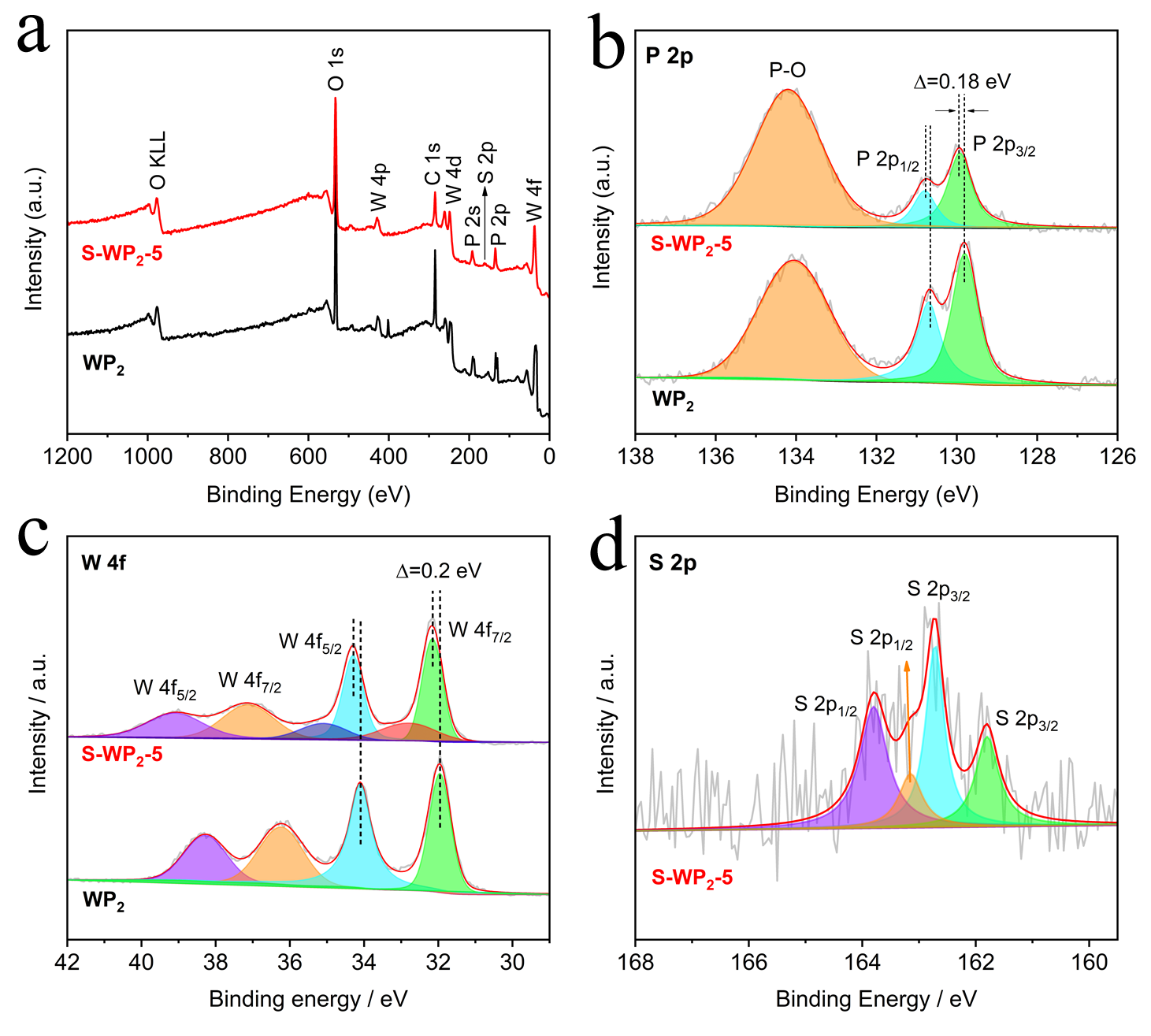 X射线光电子能谱(XPS)分析结果显示,S-WP2中的P元素的结合能出现了负移现象,W元素的结合能则正向移动,这意味着部分电子从W转移到了P,表明不同电负性S的引入可能降低WP2周围的电子密度。