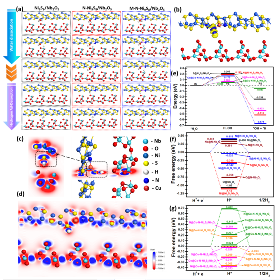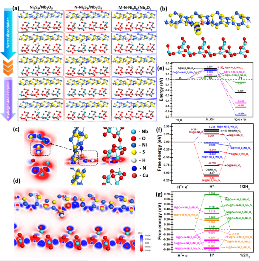 本文开发出一种氮、金属(M = Co、Fe或Cu)原子偶联的层状空间分离M-N-Ni9S8/Nb2O5纳米带新型异质结构的阴极析氢电催化剂,在酸性和碱性介质中均显示出良好的HER活性。这归因于氮和金属(M = Co、Fe或Cu)原子的掺杂使Ni9S8/Nb2O5异质界面处的局部电荷分布和电子性质得到显著调节,有效地提高了电催化剂的析氢反应活性。其中Co-N-Ni9S8/Nb2O5异质结构催化剂在酸性介质中,仅需171 mV vs. RHE的低过电位即可达到10 mA cm-2电流密度,以及69 mV dec-1的Tafel斜率;Cu-N-Ni9S8/Nb2O5异质结构催化剂表现出出色的碱性HER活性,在电流密度为10 mA cm-2时,其过电位仅为109 mV vs. RHE,Tafel斜率为51mV dec-1,接近标准Pt/C的性能。理论计算说明了氮和金属原子的掺杂可以有效地调节异质界面,加速了HER反应动力学并协同提高了异质结构的HER性能。该工作提出了一种新的合理的异质结设计策略,证明优化析氢反应动力学对于开发异质结电催化剂的重要作用。