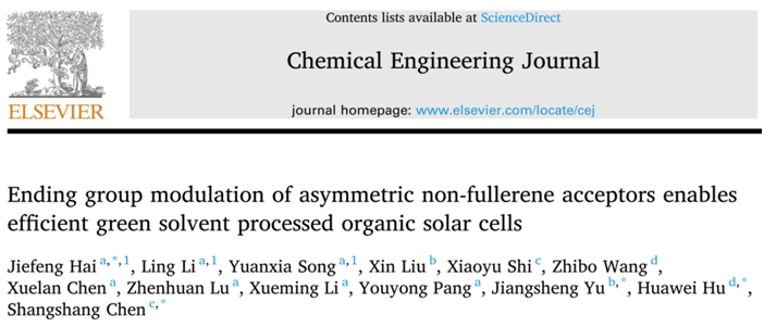 近日,2138CC太阳集团海杰峰副教授联合南京理工大学俞江升副研究员、东华大学胡华伟研究员和南京大学陈尚尚教授在绿色高效有机太阳能电池研究方面取得最新成果,在知名期刊Chemical Engineering Journal(SCI一区TOP期刊,IF=16.744)上发表题为“Ending group modulation of asymmetric non-fullerene acceptors enables efficient green solvent processed organic solar cells”的研究论文。该项研究工作得到广西自然科学基金(2022JJA120094)、广西电磁化学功能物质重点实验室开放基金(EMFM2022101)和广西高校中青年教师科研基础能力提升项目(2022KY0256)等多个项目的资助。