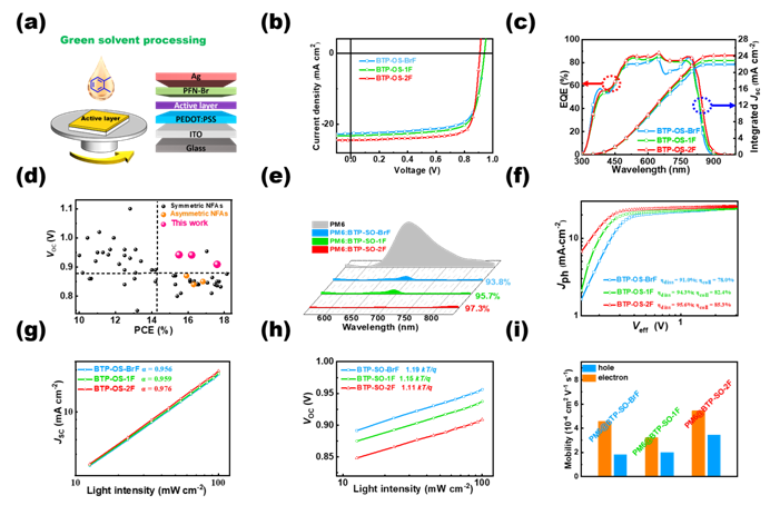 Figure 2. (a) Schematic diagram of GSP-OSC devices. (b) The J-V curves of three groups of optimal GSP-OSCs. (c) EQE curves of GSP-OSCs. (d) The plot of PCE versus VOC for representative green non-halogen solvent processed binary OSCs based on symmetric/asymmetric NFA. (e) Photoluminescence quenching spectra of the neat PM6 and three blend films. (f) Jph vs. Veff curves, (g) JSC vs. Plight curves, (h) VOC vs. Plight curves. (i) Histogram of the hole and electron mobilities of PM6:NFA-based devices.