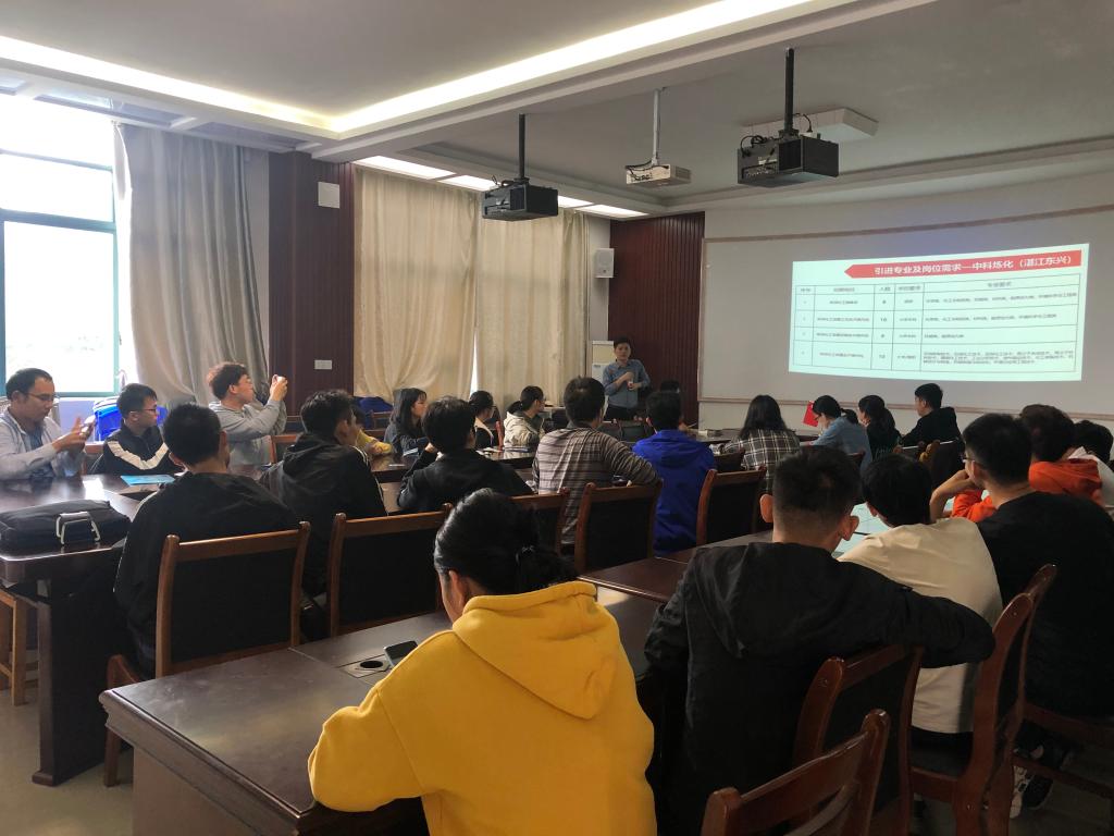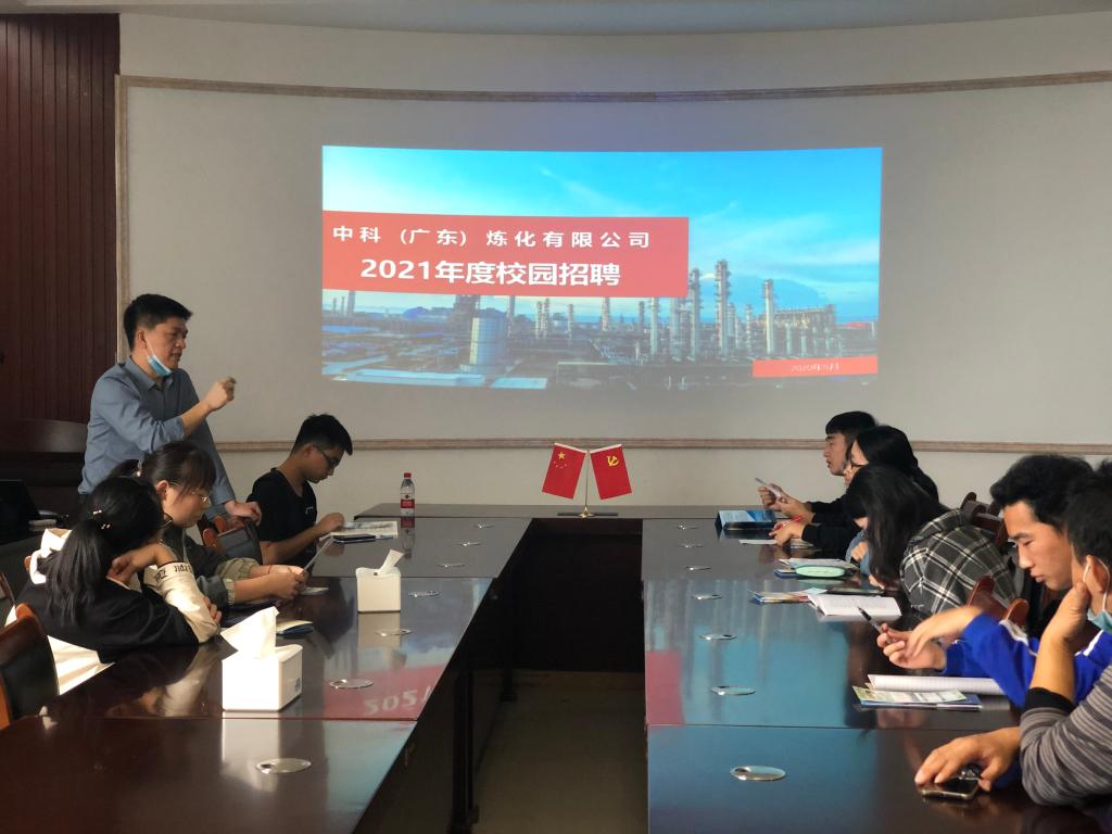 导航痕迹 当前位置: 首页 >> 招生就业 >> 招聘信息 >> 正文 中科(广东)炼化有限公司来2138CC太阳集团开展专场招聘会 作者:梁精华 发布日期:2020-10-14 浏览次数: 10月14日,中国石化中科炼化有限责任公司来到2138CC太阳集团召开专场招聘会。招聘会在雁山校区12栋萃华楼12217多功能厅召开,2138CC太阳集团化学工程与工艺、应用化学专业共计30名在校毕业生参加招聘会。 宣讲会伊始,同学们共同观看了中国石化中科炼化有限责任公司宣传片。接着,企业代表从公司概况、组织架构、福利待遇、日常生活、当地政策等方面做了详细介绍,并针对同学们提出的问题进行了相应解答。 据悉,中国石化中科炼化有限责任公司是中国石油化工集团有限公司旗下子公司,经营业务包括原油进口、加工;石油产品、石化产品的生产、储存、销售;食品添加剂硫磺的生产、储存、销售;成品油出口,来料加工;自用码头、油库的建设、经营;油品储存;产品运输配套服务,是一家集研发、生产、销售新能源材料(锂离子电池电解液、铝塑膜)于一体的国家高新技术企业。 中科(广东)炼化负责人为毕业生作招聘宣讲 招聘宣讲会现场 上一条:广西梧州中恒集团股份有限公司到2138CC太阳集团洽谈合作事宜并开展专场招聘毕业生活动 下一条:诺德投资股份有限公司来2138CC太阳集团开展专场宣讲会